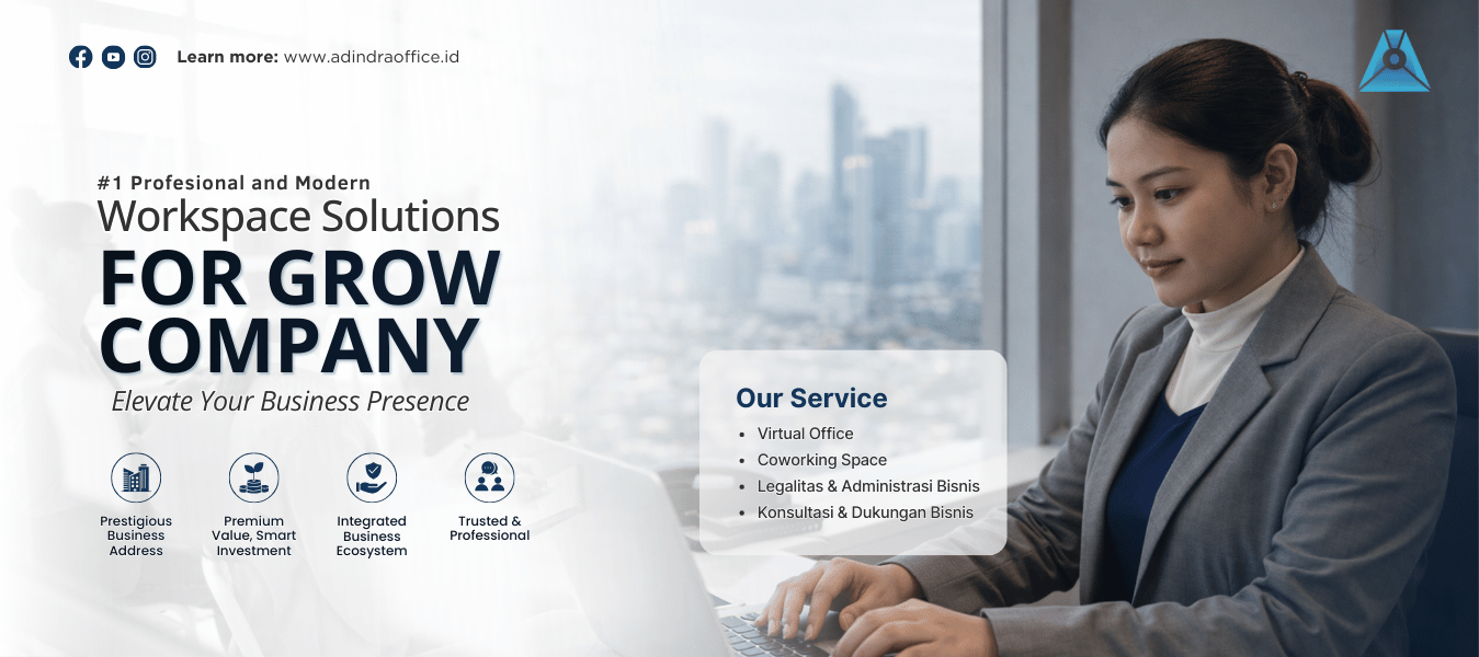 Adindra Office adalah perusahaan penyedia layanan ruang kerja profesional dan dukungan administrasi bisnis yang membantu UMKM, startup, dan perusahaan berkembang menjalankan operasional secara legal, efisien, dan profesional.